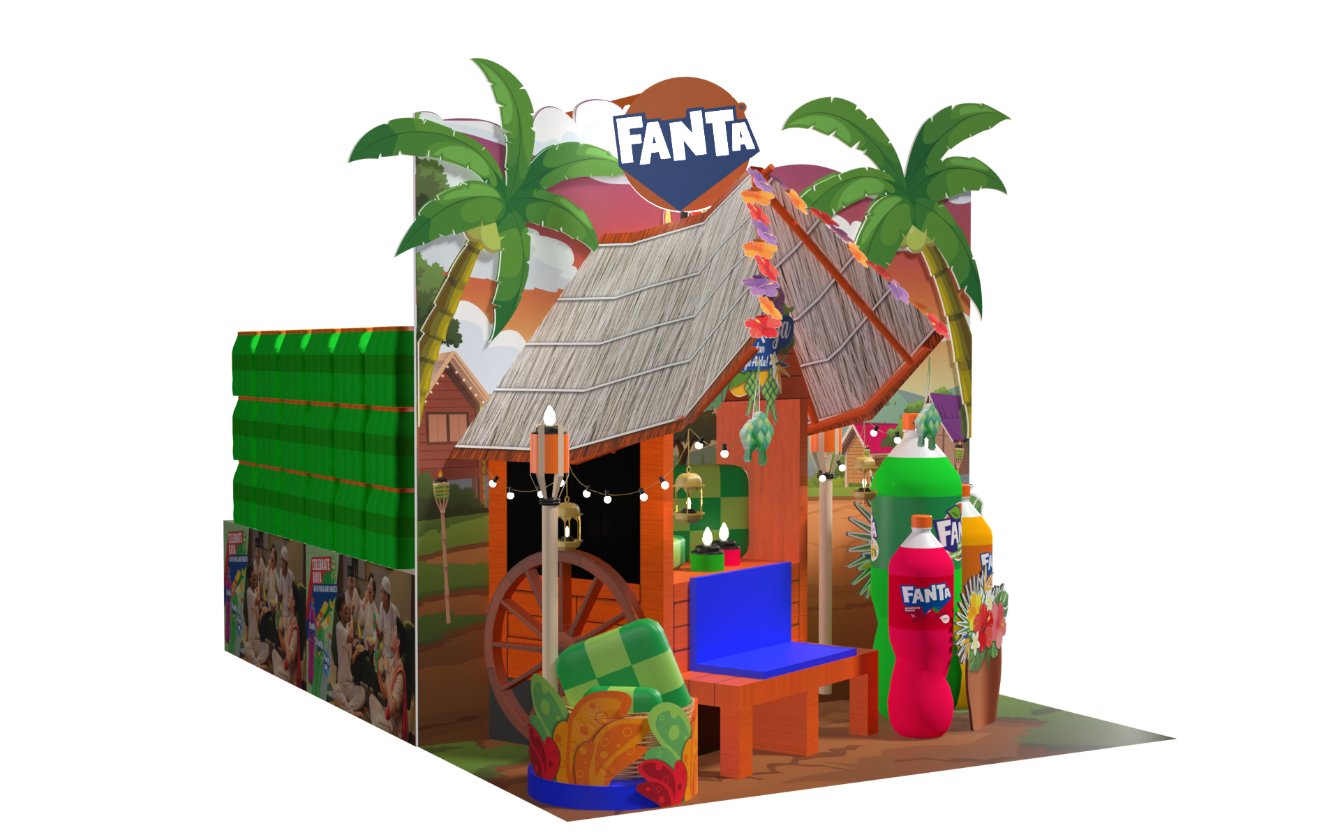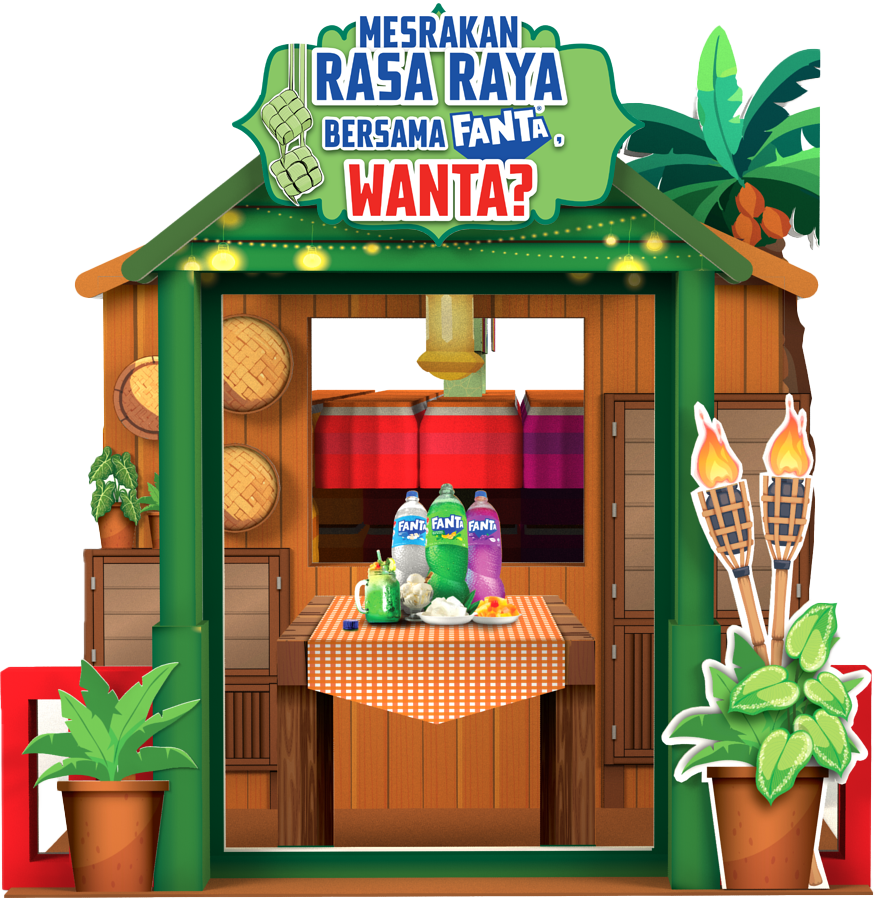 This mega display brings the warmth of a traditional Malay home to life, featuring a wooden table with a table mat and festive food. Built using eco cards, the setup includes cut-out Fanta bottles placed on the table — highlighting Fanta as a must-have item at every Hari Raya celebration and enhancing the spirit of togetherness and festivity.
